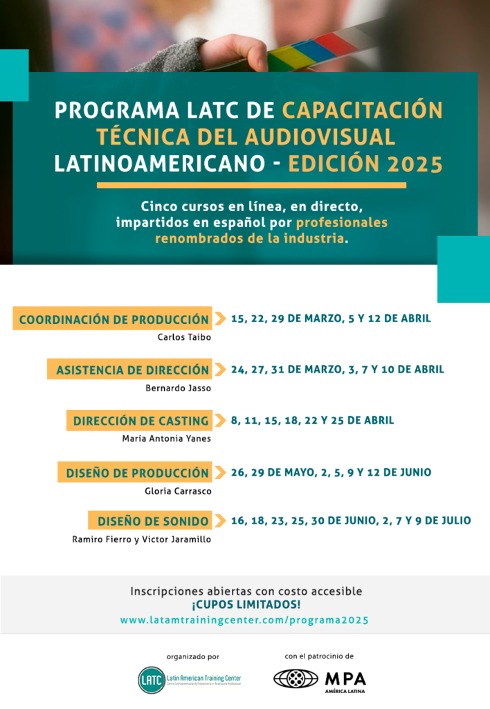 El Latin American Training Center-LATC y la Motion Picture Association (MPA) se complacen en anunciar una nueva serie de cursos de capacitación técnica en español para profesionales de la industria audiovisual de Latinoamérica, tras el gran éxito de las ediciones anteriores, con participantes de toda la región. Las inscripciones para los cursos, que se llevarán a cabo en línea, entre marzo y julio de 2025, ya están abiertas.
