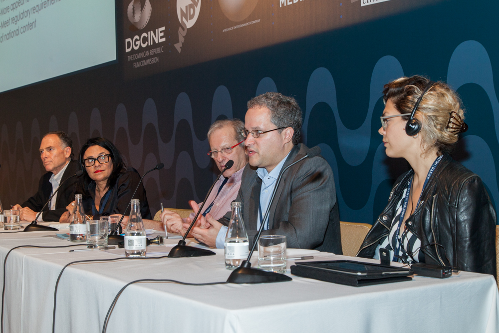 The panel speakers included Vania Catani, Producer, Bananeira Filmes; Nelson Hoineff, President, Brazilian Institute of Television Studies; Rodrigo Salinas, Partner, Cesnik Quintino e Salinas Advogados; and Cristina Garza, Vice President, Mundial.